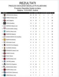 U organizaciji Karate saveza Republike Srpske i tehničkog organizatora KK”Unsu”, juče je u Bijeljini održano Prvenstvo Republike Srpske za djecu. U konkurenciji 421 takmičara iz 42 kluba generalni plasman bio je sljedeći: